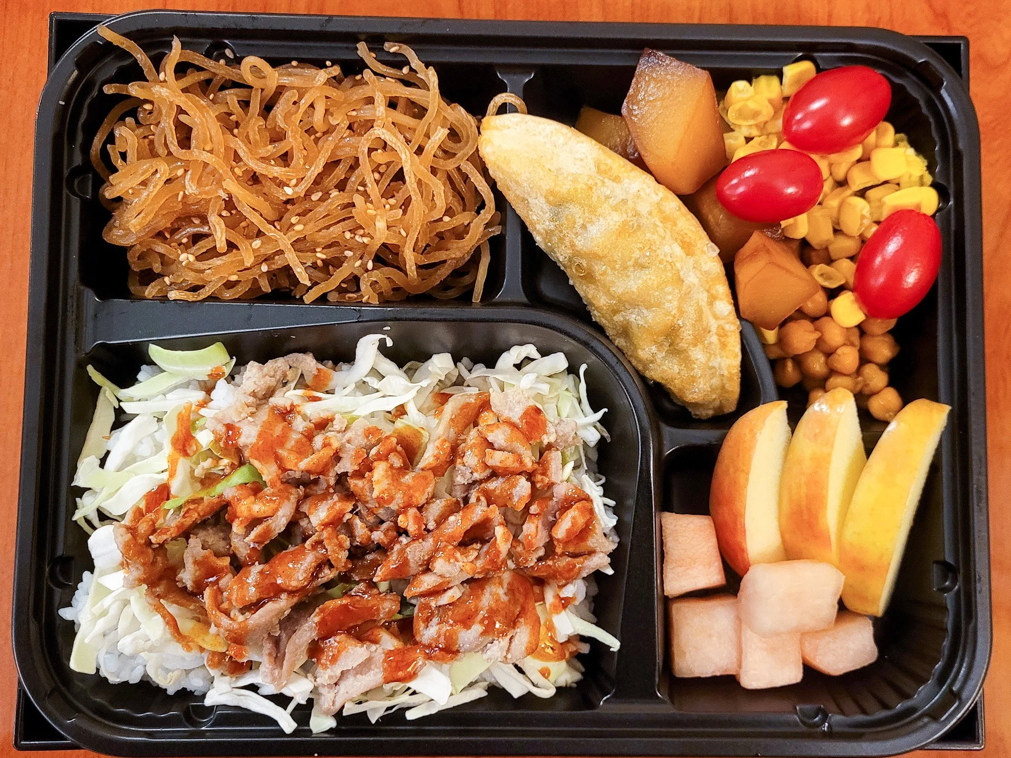 Each bento box has seasoned potato, beans, fruit, tomato, pickles, a crunch dumpling, sweet potato noodles, and salad mix over rice.